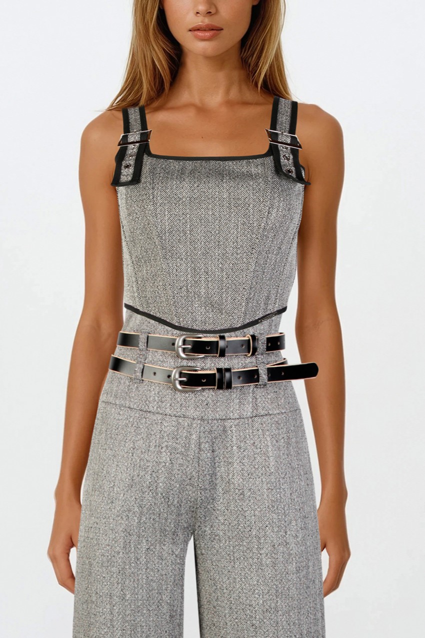 • Os cintos duplos em contraste marcam a cintura e introduzem um detalhe de força e modernidade, equilibrando o rigor da alfaiataria com um toque de atitude.