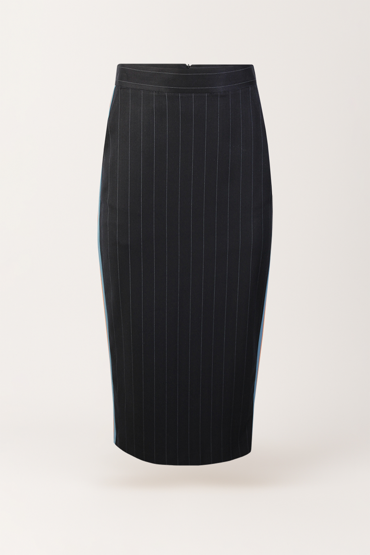 - Camisa em tecido de alfaiataria com padrão risca de giz. Apresenta gola clássica, manga comprida e fecho frontal com botões metálicos.