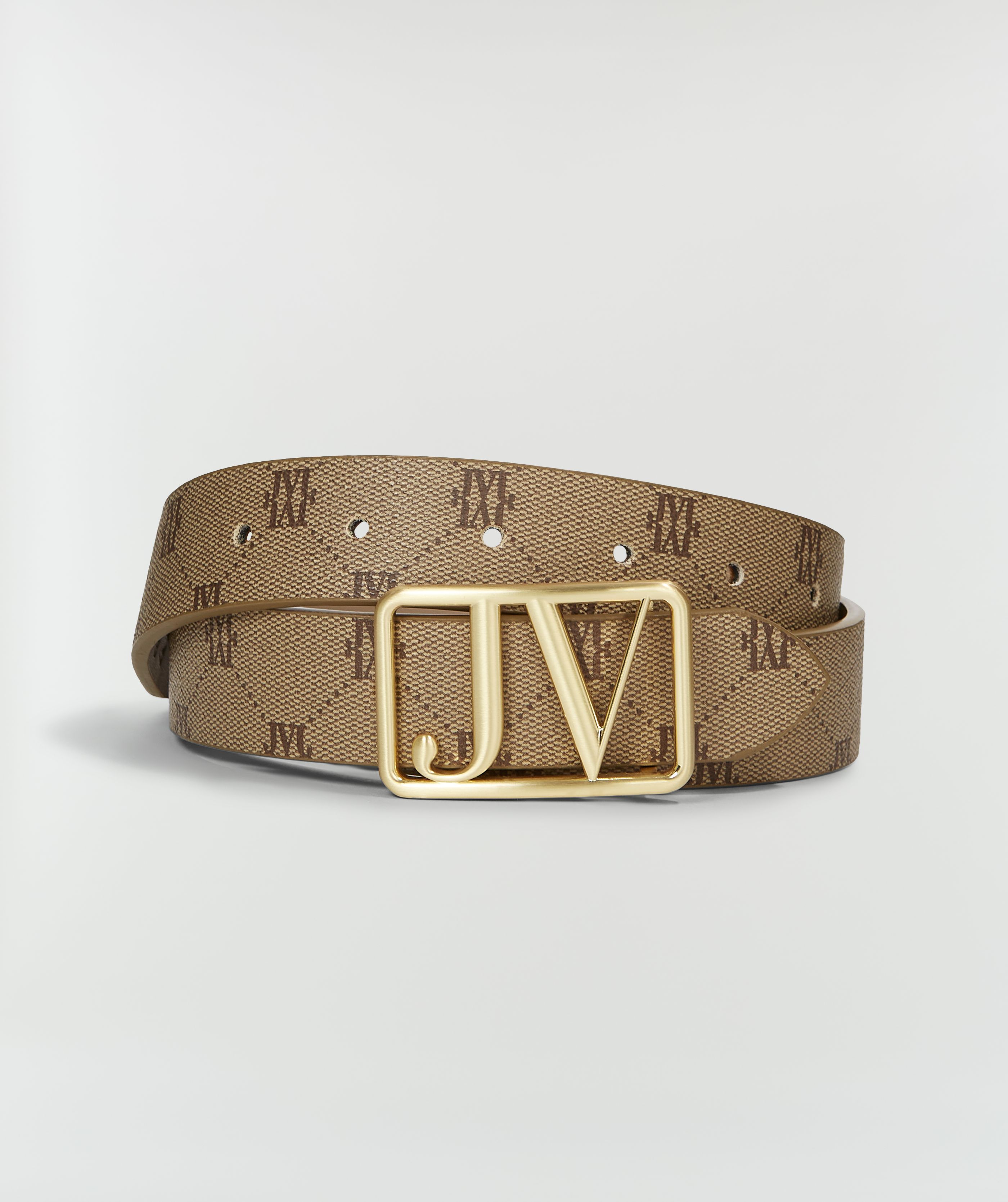 - O cinto de couro sintético tem uma fivela JV removível, facilitando a troca de lados.